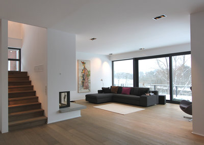 moderner Einfamilienhaus-Neubau mit offener Raumabfolge, großen Fenstern und hohen Decken