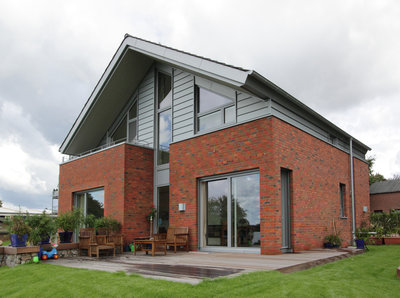 Einfamilienhaus-Neubau mit markanter Fassade aus klassisch rotem Klinker und Metall.